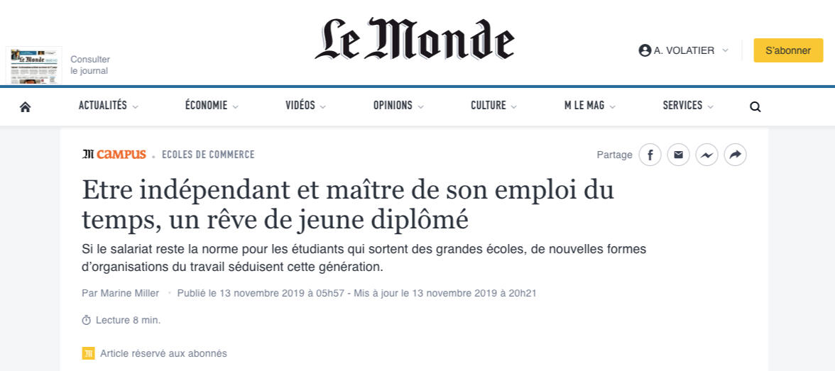👉 Témoignage dans l'article du journal Le Monde : "Etre indépendant et maître de son emploi du temps, un rêve de jeune diplômé"